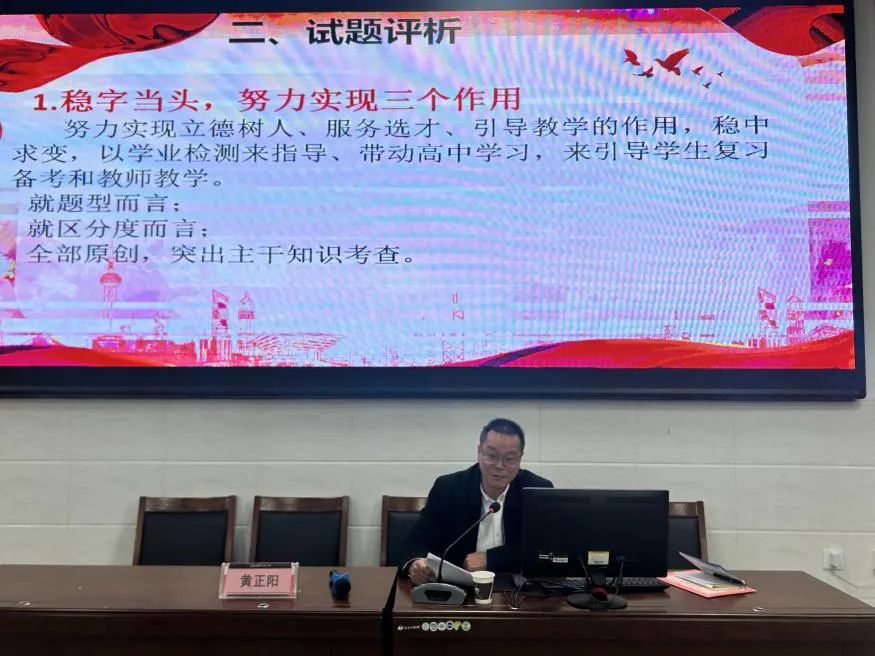 分科会第二项议程:专题讲座。我校党委委员、政治正高级教师黄正阳老师以《2025届岳阳市一模试题及考情分析》为题,从试卷结构、试题评析、考情分析三个维度对岳阳市一模考试进行了分析,逻辑清晰,内容详实,既深入剖析了试题的核心要点,又结合了实际案例进行了生动讲解,具备理论深度和实操性,对思想政治教学具有重要的指导意义。