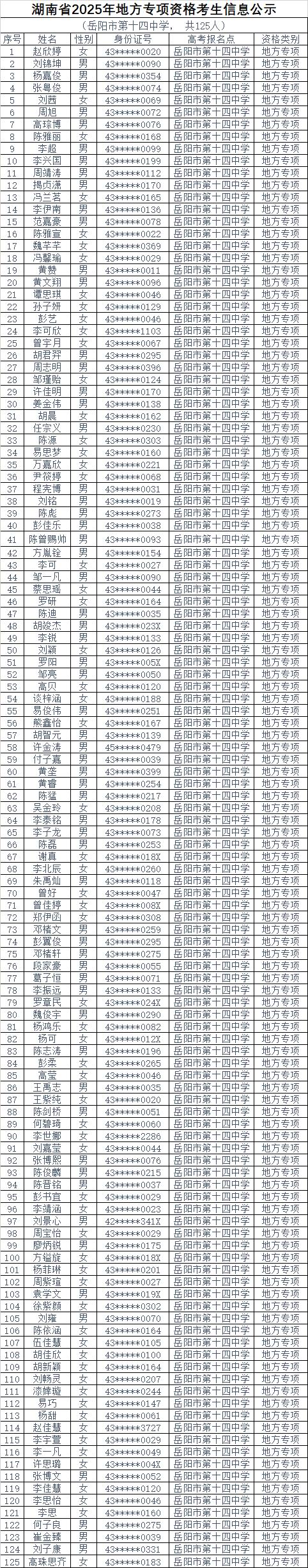 湖南省2025年地方专项资格考生信息公示 (岳阳市第十四中学, 共125人)
