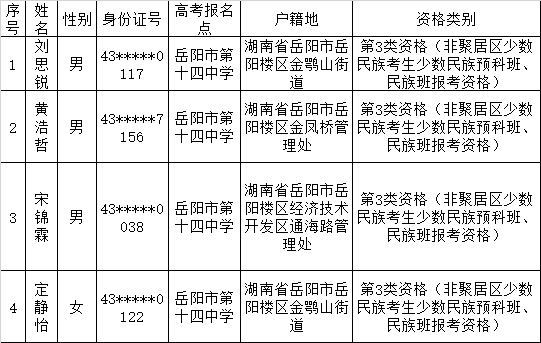湖南省2025年民族预科班、民族班资格考生信息公示 (岳阳市第十四中学, 共4人)