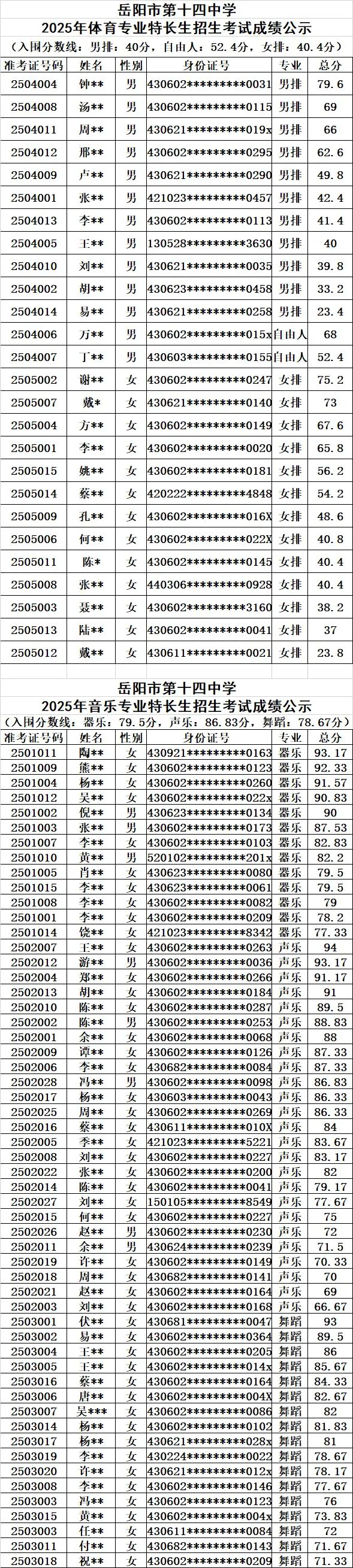 岳阳市第十四中学2025年学科特长生、艺体专业生招生考试成绩公示