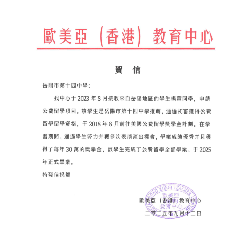 2018年,美国公费留学项目落户岳阳,授牌仪式在岳阳市第十四中学举行,并在学校设立遴选中心,为成绩优秀、综合能力强的学生提供申报赴美公费留学。